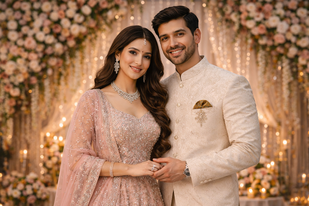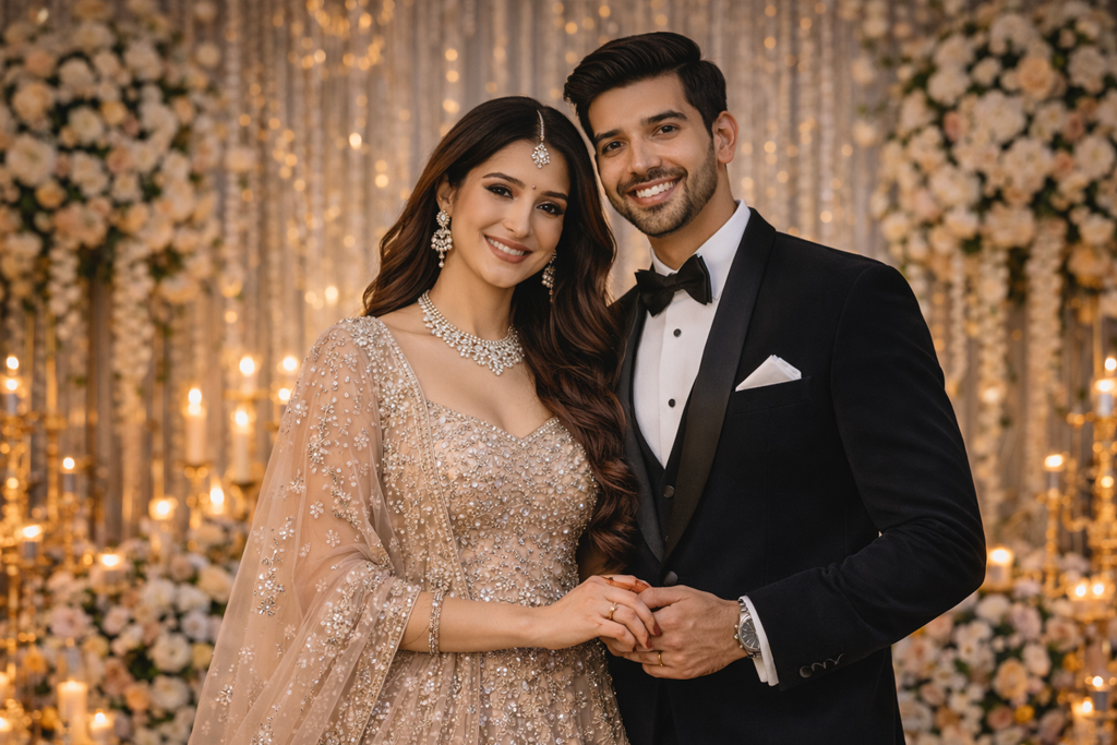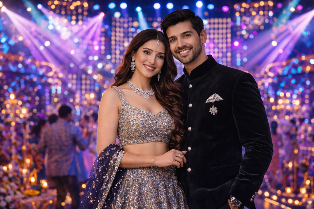 Reception looks best when you keep it sharp and less chaotic. Unlike sangeet, where glitter and movement make sense, reception photos look timeless when outfits are structured and styling is balanced.