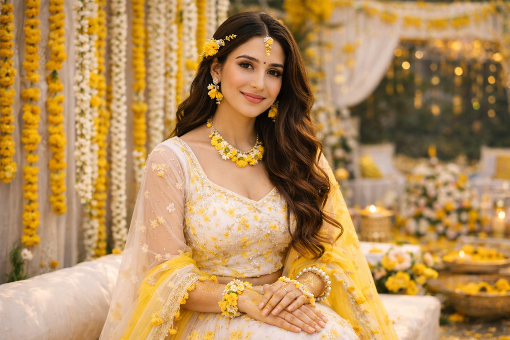 Go simple and comfortable—cotton saree, basic kurta set, or a light skirt-set in yellow/white. Avoid expensive fabrics because haldi stains and mess are common.