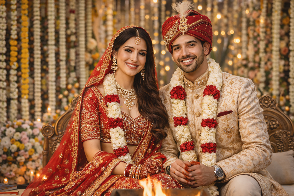 It depends. If you don’t know the bride’s outfit colour, it’s safer to avoid full bridal-tone red/maroon for the main wedding. For other functions, red can be fine if it doesn’t look bridal-heavy.